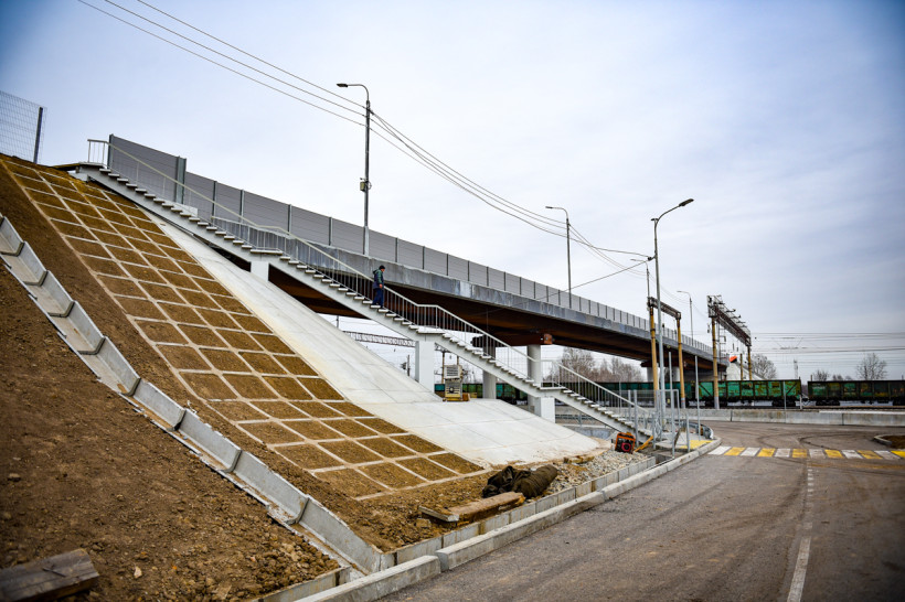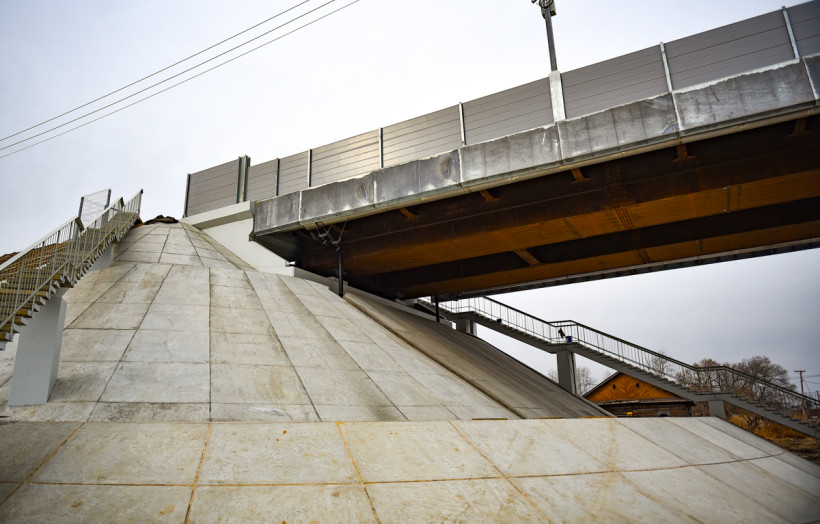 Протяженность нового сооружения составляет 174 метра, его промежуточные опоры находятся в габарите железной дороги. Пролетное строение – металлическое из атмосферостойкой стали, не требующей антикоррозийной защиты на протяжении всего срока эксплуатации.