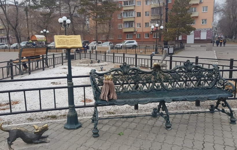 Уже по традиции в Благовещенске сердобольные амурчане начинают утеплять полюбившихся им скульптурных героев. Вот и на набережной Амура невозмутимый кот из одноименной композиции Николая Неведомского уже укутался в теплый шарф. Впервые кота и сороку стали так наряжать в феврале 2016 года.