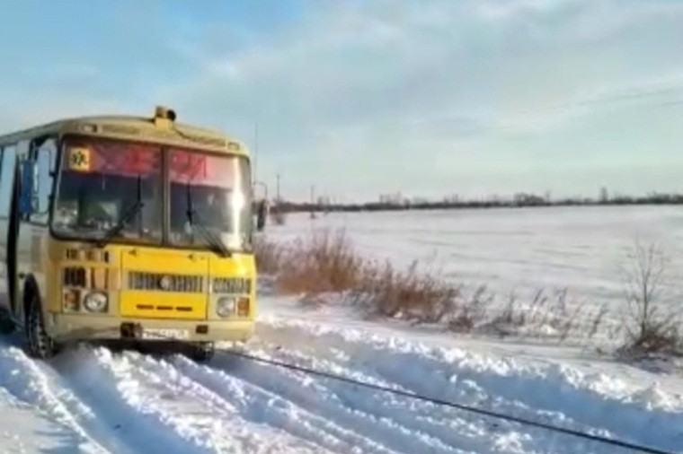 Школьный автобус застрял на заснеженной трассе в Михайловском районе
