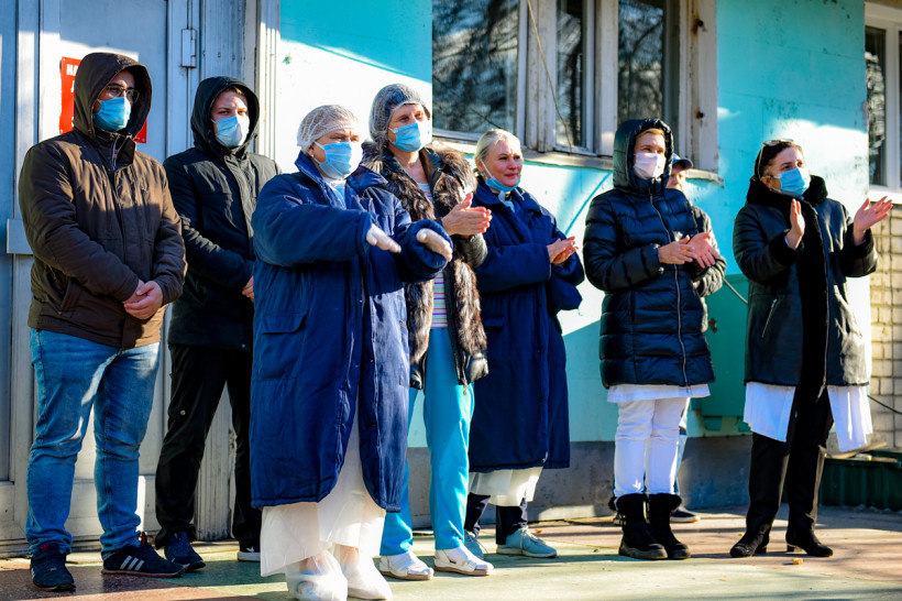 Главные герои — медработники, с удовольствием приплясывали прямо на крыльце госпиталя, на несколько минут забыв про тяжелую работу.