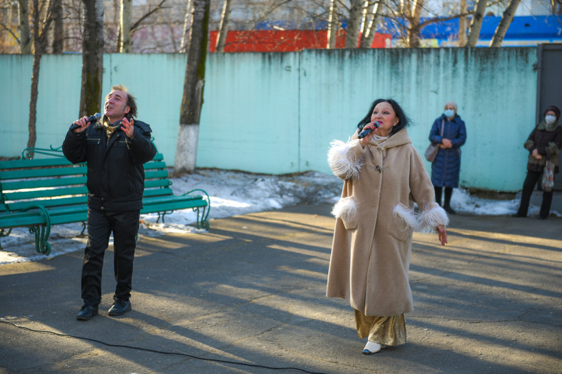 «Медсестричка, медсестричка, под косынкой две косички. Я готов глотать любые микстуры и на всякие готов процедуры», — весело признался в любви медработникам солист филармонии Борис Боровиков. Поднять настроение пациентам и придать силы медикам — такую непростую задачу поставили певцы Борис Боровиков и Ирина Атакова. В пятницу, 15 ноября, не испугавшись ветра и мороза, они устроили небольшой концерт прямо под окнами ковидного госпиталя в Благовещенске. Помогает ли песня выздороветь, узнали и корреспонденты «Амурской правды».