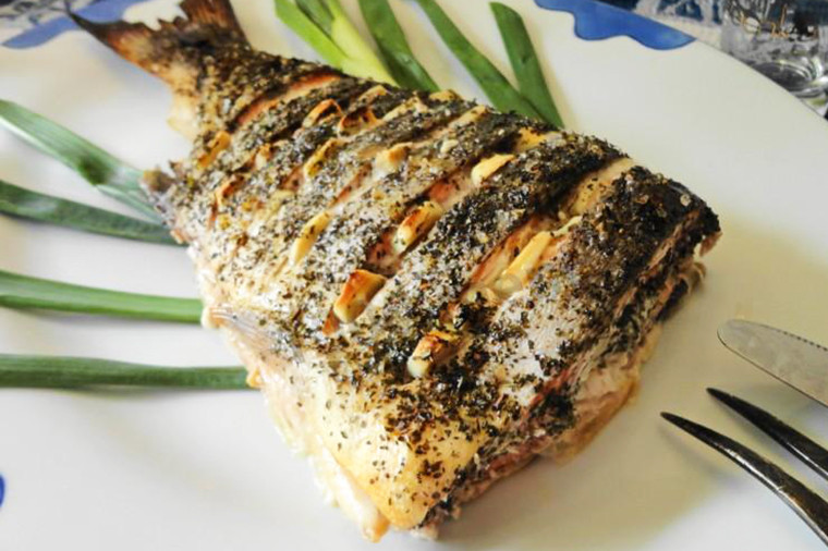Рыбу очистите от чешуи, промойте и подсушите бумажными полотенцами. На рыбе с обеих сторон сделайте надрезы острым ножом через каждые три сантиметра. Посолите, поперчите, в разрезы вставьте пластинки чеснока, посыпьте зеленым чаем и сбрызните кунжутным маслом. Застелите противень бумагой для выпечки и выпекайте 30 минут в духовке, нагретой до 190 градусов. Сильно зажаривать рыбу не надо, иначе она высохнет. Подавать на стол в качестве горячей или холодной закуски.