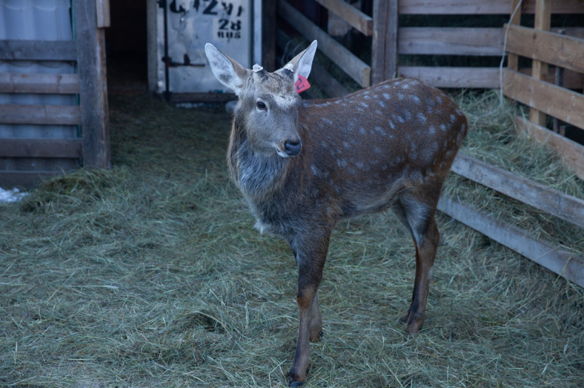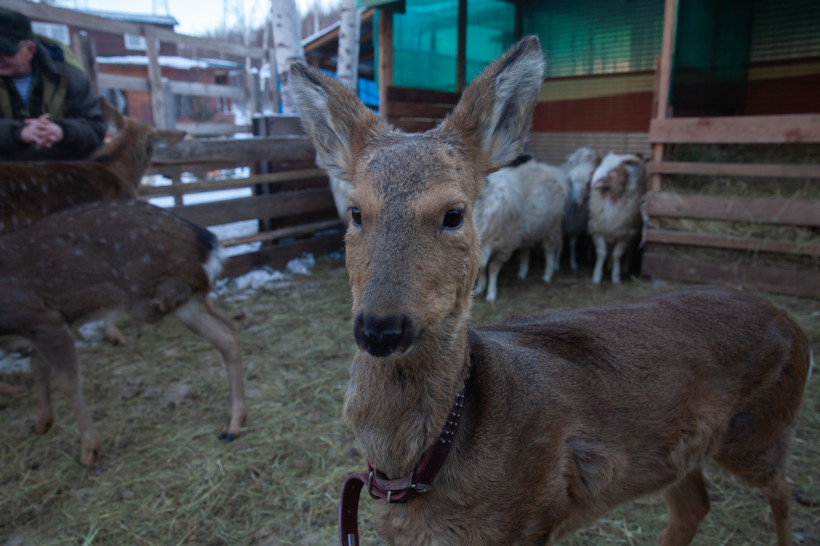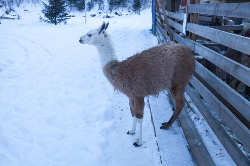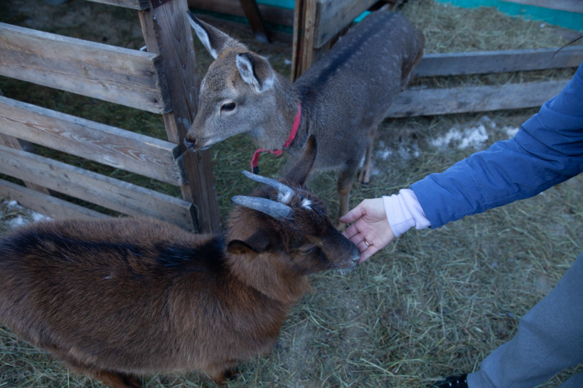 Интересно, что животные все вместе гуляют в общем загоне. У них есть четыре теплых домика и каждый сам выбирает, где жить. Ручных также выпускают гулять по территории. Здесь свой социум и сложная иерархия. «Наш Егорка, лама, гонял верблюдов, когда их только привезли. Показывал, кто тут хозяин. А теперь они освоились и сами не прочь задеть его: могут тяпнуть за ляжку, если зазевается», — рассказывает Татьяна. Стоит Александру подойти в животным, как беременная олениха Милана настойчиво тычется в руки, требуя ласки. Тянется поцеловать хозяина и верблюд.