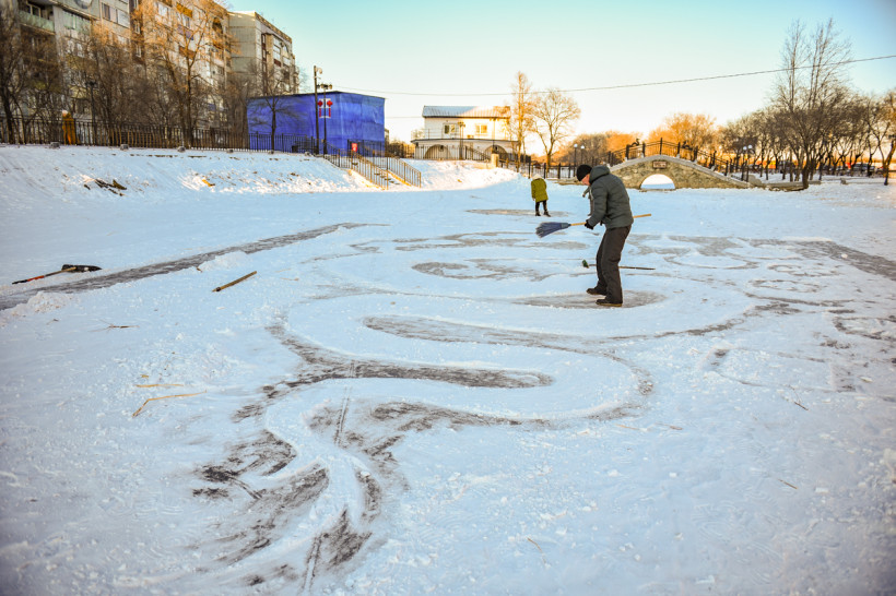 Вообще сотрудники ОКЦ придумали два сюжета ледовой открытки: на первой хотели изобразить амурского тигра — символ будущего 2022 года, а на второй — дракона. Коллектив ОКЦ проголосовал все-таки за волшебного героя, которого нарисовал Станислав. В итоге дракон и появился на льду пруда.