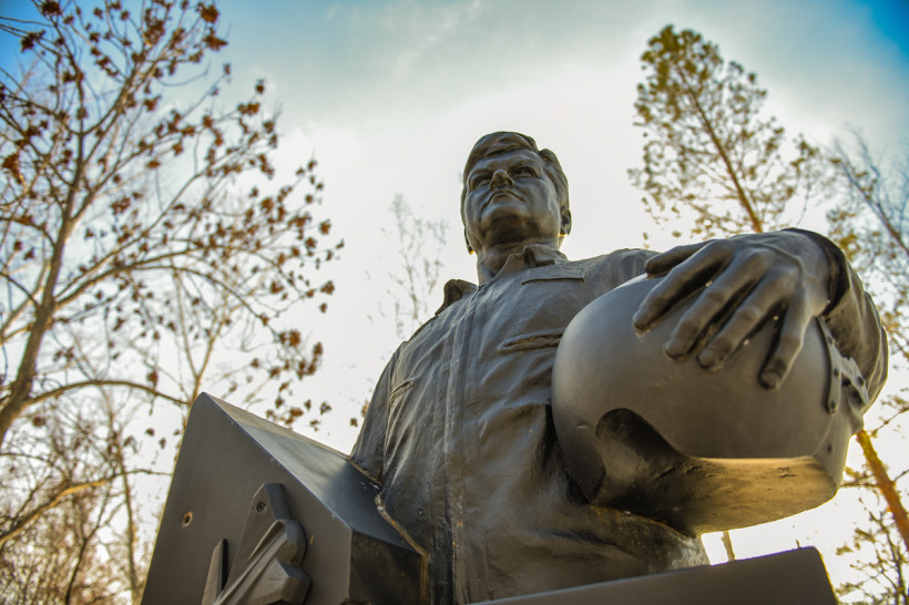 Памятник погибшему Олегу Пешкову установлен сразу за въездом на территорию военной части в Возжаевке, где несколько лет служил и осваивал бомбардировщик будущий герой. Чтобы взглянуть на устремленное в небо лицо летчика, нужно пройти через плац перед зданием штаба. Около памятника стоит баннер с информацией о жизни Олега Пешкова — сухие факты биографии. Но в части можно найти тех, кто готов поделиться воспоминаниями о легендарном летчике.