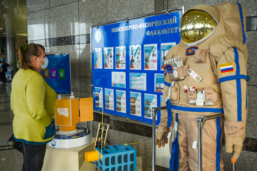 Первым внимание посетителей притягивает костюм космонавта: АмГУ не в первый раз демонстрирует этот экспонат, и он продолжает оставаться одним из самых популярных объектов для селфи. Кроме того, университет предложил посетителям познакомиться с малым космическим аппаратом CubeSat. «Это прототип реального аппарата связи. Такой же сейчас все еще летает по орбите Земли и выполняет свою программу связи: собирает и передает информацию», — рассказал АП третьекурсник Александр Хватков.