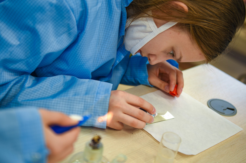 Чтобы выполнить задание, школьники на специальное обезжиренное спиртом стекло помещали каплю воды, а затем с помощью бактериологической петли (палочки с петлей на конце) клали туда материал: наставник заранее вырастила в чашках Петри колонии бактерий на специальном питательном субстрате. Потом мазок окрашивали, сушили и фиксировали с помощью зажженной горелки, после чего рассматривали в микроскоп. В итоге опыт был признан успешным: каждый смог увидеть палочковидные и шаровидные бактерии.