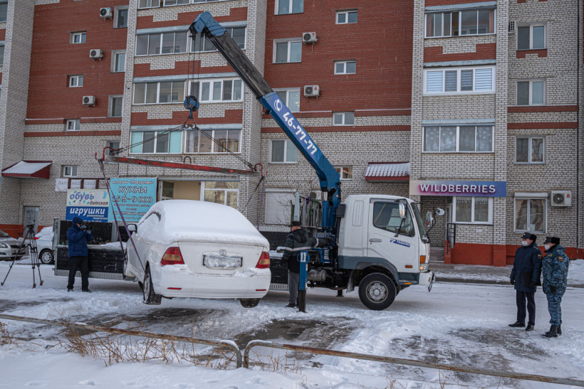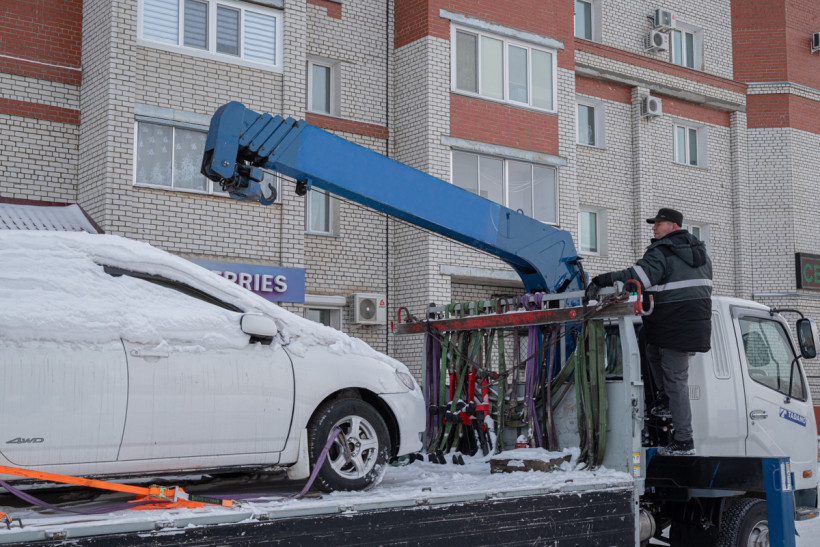 Потребовалось меньше получаса, чтобы изъять имущество у неуловимого неплательщика. Белую иномарку, слегка припорошенную снегом, погрузили на эвакуатор на глазах журналистов и прохожих.