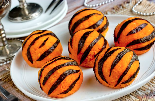 Приподнимите пакет и скрепите края морковного слоя так, чтобы начинка покрылась им со всех сторон, а шарик приобрёл аккуратную круглую форму. Таким же образом сформируйте остальные шарики. Для придания морковным шариками тигрового узора понадобится листик нори. Нарежьте нори полосками, имитирующими чёрные полосы на шкуре тигра. Для того, чтобы полоски как следует прилипли к морковным шарикам, смажьте поверхность каждой полосы холодной водой и по мере смачивания приклеивайте к морковной поверхности. Вместо нори для придания тигровости можно воспользоваться черносливом или маслинами, но нори прямо идеально подходит для этой цели! Праздничная закуска готова.