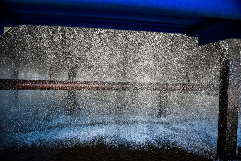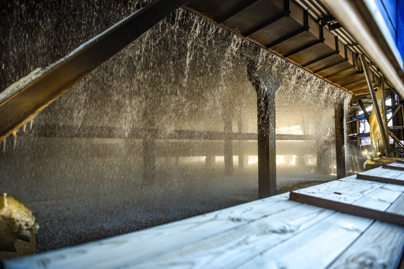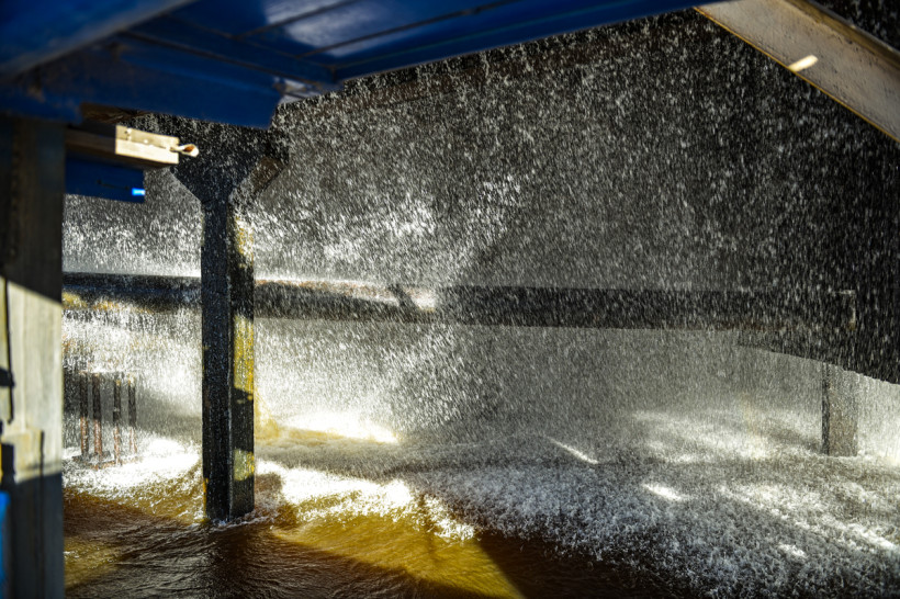 Заглянули корреспонденты АП и внутрь градирен. Нижний «этаж» сооружений представляет из себя чашу бассейна, а выше — система оросителей: вода разбрызгивается и падает дождем вниз, охлаждаясь. Внизу на градирнях открываются «жалюзи», через них поток воздуха задувает в башню и из‑за суженной конструкции с силой поднимается вверх. Вода из градирни выходит с температурой 20 градусов.