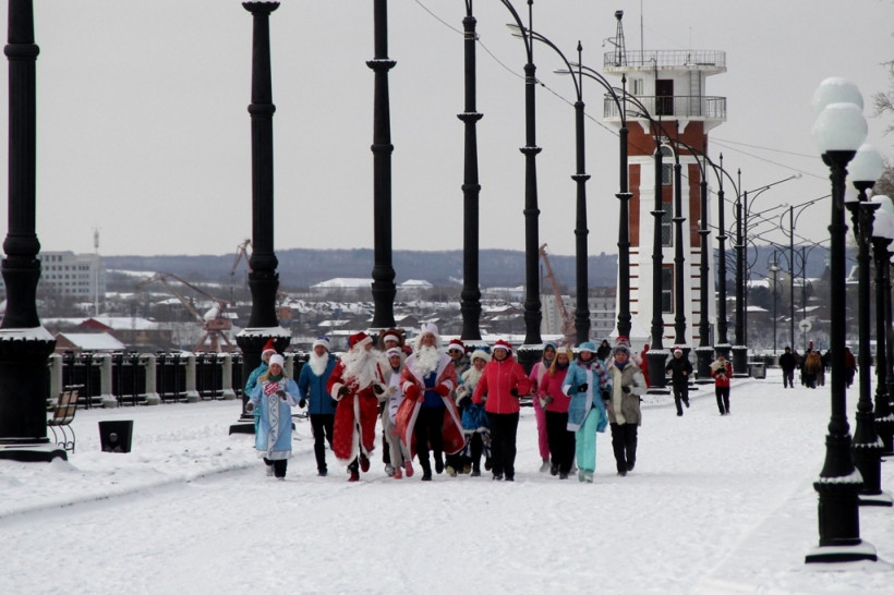 В комфортном темпе Деды Морозы, Снегурочки и зайчики пробегут по набережной Благовещенска от стадиона «Амур» до площади Ленина и обратно.