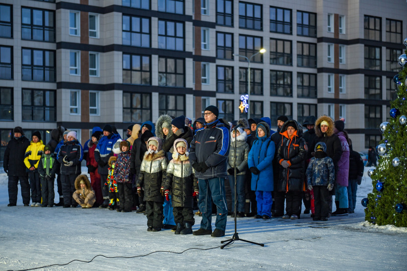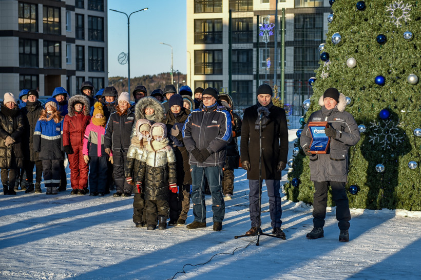 В морозном воздухе звенит ощущение праздника – и строители, и семьи работников Амурского ГПЗ с детьми с волнением ждут прямого включения из Москвы: с установленного на улице экрана на связь со Свободным выходит Алексей Миллер.