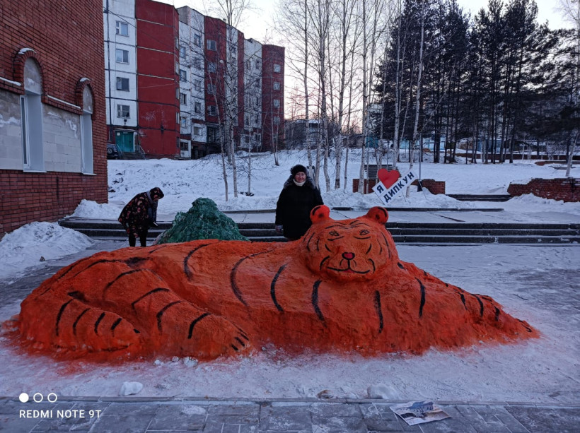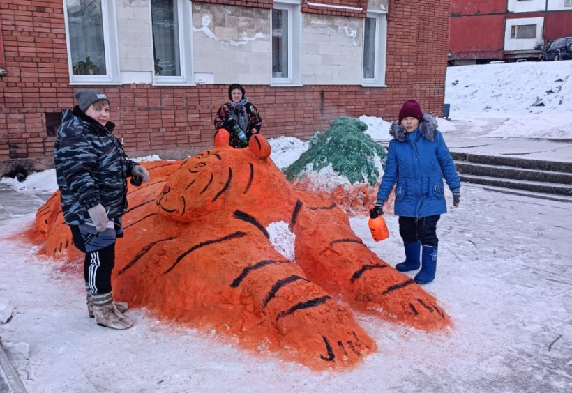 — В этом году мы с директором филиала Центра развития культуры, спорта и архивного дела поселка, а по-нашему просто клуба, Анастасией Бурдуковской решили вылепить символ 2022 года, — рассказала «Амурской правде» бывшая глава Дипкунского сельсовета Ирина Сокольникова. — Впятером — мы с ней, сотрудники клуба Оксана Шохирева, Ольга Романова и Галина Царегородцева — в течение двух дней, на морозе -28 градусов создали свой шедевр. Кучу снега нам заранее заготовили дворники, когда чистили территорию, и ребята, что занимаются в спортивных секциях. В этом году у нас малоснежно. Мы сделали тигра, залили его подкрашенной водой. Специально нарисовали ему добрую морду, чтобы 2022-й стал для всех добрым, радостным и богатым годом. В сельском чате в WhatsApp попросили жителей бережно относиться к тому, что для них делается, потому что в первый же вечер тигру отбили уши.