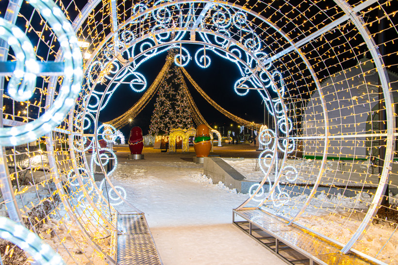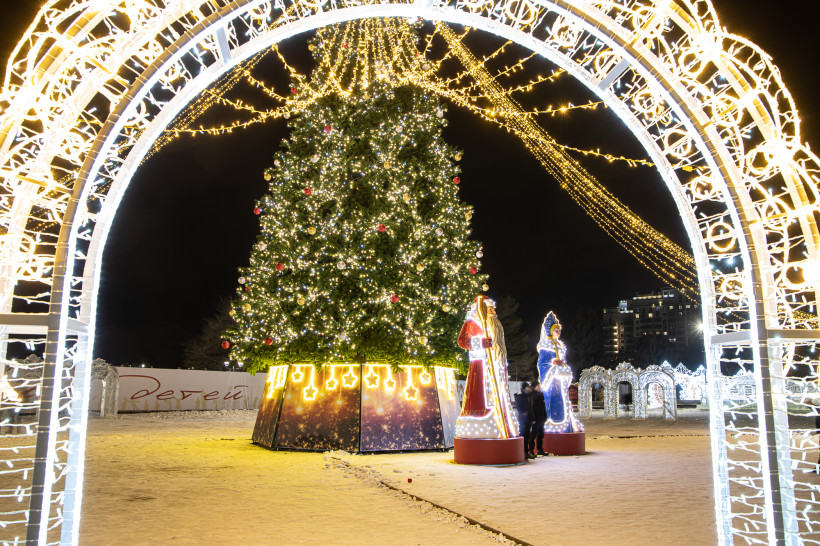Праздничное настроение создают новая 20-метровая альпийская ель с гирляндами и шарами и ледяные арки.