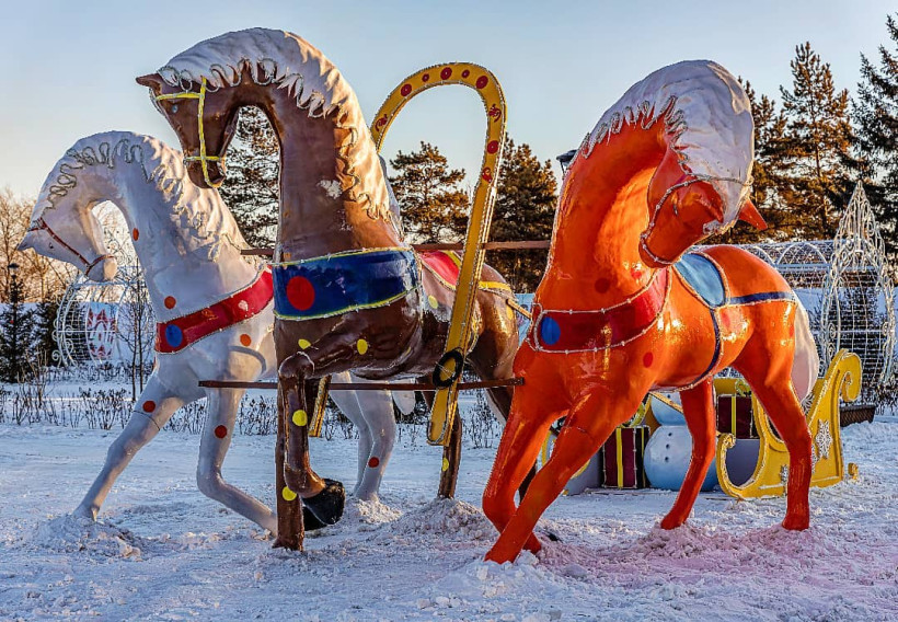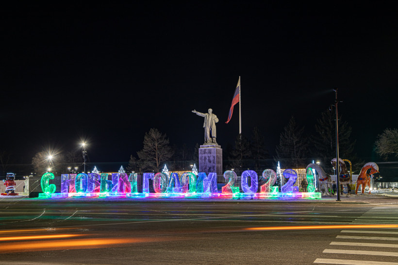 Амурская столица готова к встрече главного зимнего праздника. В этом году на площади Ленина поселились персонажи из русского фольклора – матрешки, медведи, Баба-яга, Дед Мороз и Снегурочка, установлена и голова богатыря Светозара.