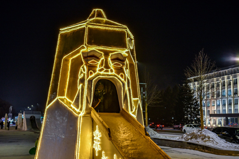 На обновленной площади Ленина в этом году решили обойтись без ледовых скульптур и установили, а кое-где и повесили пластиковые светящиеся. Так, около дерева в ступе «летает» и никого не пугает 1,7-метровая Баба-яга, верная избушка-старушка остановилась рядом отдохнуть. Веселую музыкальную композицию играют ослепительные в прямом смысле слова снеговики и медведь.