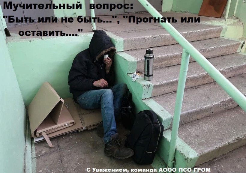 По разным причинам люди превращаются в бездомных. И тут хочу заметить, что 98 процентов из всей массы — это мужчины. Кто-то выбрал этот путь сам, потому что не хочет работать и обеспечивать себя, а кто-то попал в такие обстоятельства, из которых не смог выпутаться. Психология мужчины устроена так, что он боится признаться родным и в первую очередь самому себе, что попал в сложную жизненную ситуацию, что не может сам справиться. Мужчина до последнего верит, что сам все решит, опускаясь при этом ниже и ниже. Поэтому, если вы встретили бездомного человека в своем подъезде, подвале или чердаке, не гоните в холода его на улицу, а помогите. Люди ночуют в таких местах от безысходности. Настаивать на уходе стоит только, если человек ведет себя агрессивно и его поведение угрожает безопасности жильцов.