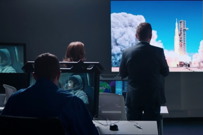 Вот главный герой заходит в помещение, откуда идет управление запуском. С одного экрана ему показывают космонавтов, которые первыми из российских ступят на Луну, — Исламбека и Гульнару, с другого — белоснежную ракету на стартовом столе. Начинается обратный отсчет.