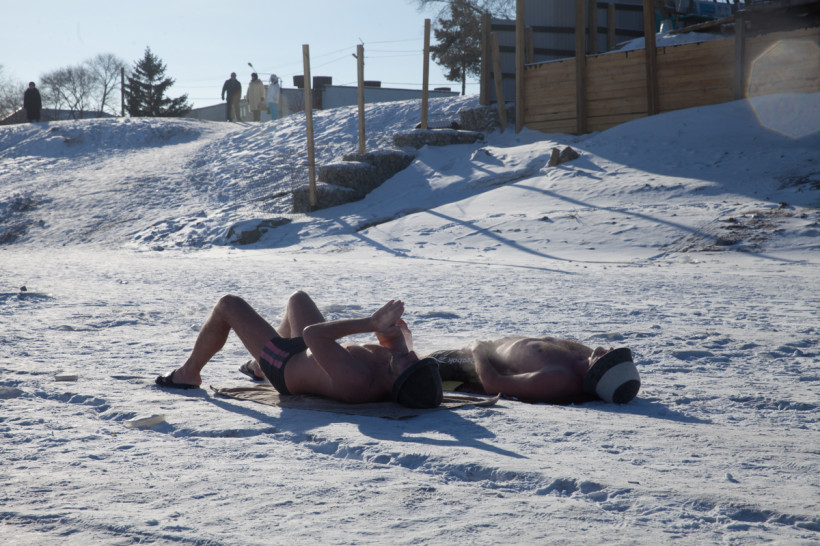 — Мы солнечные ванны уже с декабря принимаем, — рассказал морозостойкий молодой человек. — Раз в неделю обязательно ныряем в прорубь, а потом несколько минут лежим на солнышке. Всем рекомендую. К лету ты уже загорелый, даже на пляж ходить не нужно.