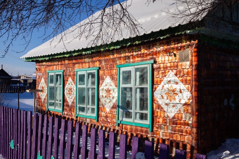 — Когда я начинала этим заниматься, никаких сайдингов, которыми сейчас отделывают дома, не было. Облицовывали железом, а оно же холодное. Зато от пластика дом нагревается – тепло, красота! — радуется Татьяна Михеева. — Долго делала — я же только в теплое время года могла этим заниматься. Бутылки тогда трудно было достать! То из Свободного привозили, то из Благовещенска, я сама собирала где могла. Иногда дети из школы за печенье приносили, иногда — соседи. Хотя поначалу и они, и мужик мой смеялись надо мной — говорили, дурью маюсь. В деревне же как – все на виду, все знают, кто чем живет. На все ушло тысяч пять бутылок, килограмма три гвоздей. Хорошо, потом степлер появился – ой, с ним так удобно стало! – вспоминает Татьяна Михеева.