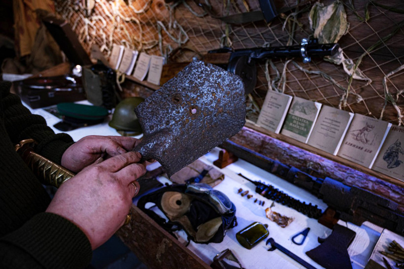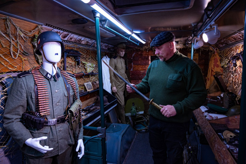 На другом безликом манекене легко узнать обмундирование немецкого воина. В первую очередь эсэсовца выдают характерные черные усики, подрисованные маркером. «Оригинальная японская форма тоже есть, но она на рост 150 сантиметров. На стандартный манекен не налезает, надо искать маленький», — демонстрирует комплект одежды на вешалке экскурсовод.