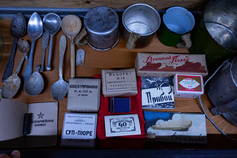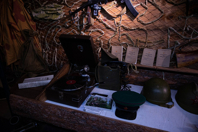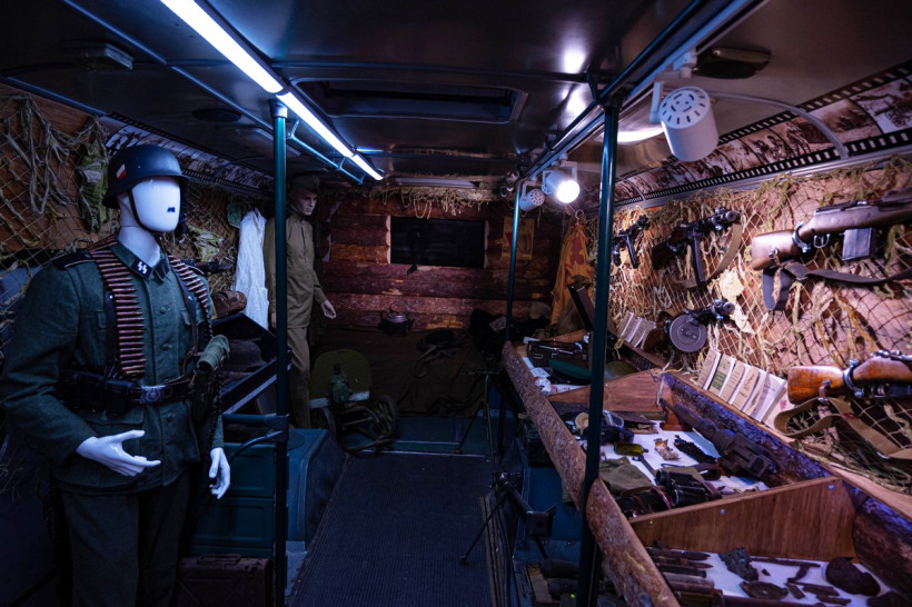 Обитый горбылем по периметру и затянутый сеткой салон автобуса больше напоминает полевое укрытие. Внутри просторного блиндажа есть все что необходимо солдату в бою — от оружия и боеприпасов до военной формы, патефона и даже запаса махорки. Количество и разнообразие экспонатов на квадратный метр поражают. И это лишь часть реликвий, переехавших в Автобус Победы из морского контейнера, где музей воинской славы располагался раньше.