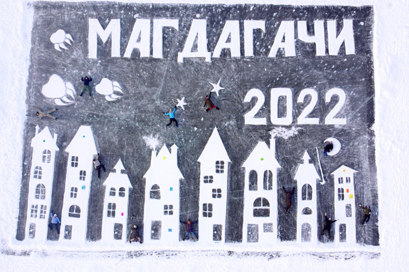 7. На льду карьера Тыгды снежный привет появился благодаря большой и дружной семье Анастасии Старовойтовой. Нарисовать открытку решили во время душевных домашних посиделок. За час всё спланировали, сделали эскиз, дружной компанией из 11 человек вышли на лед и сотворили настоящее чудо.