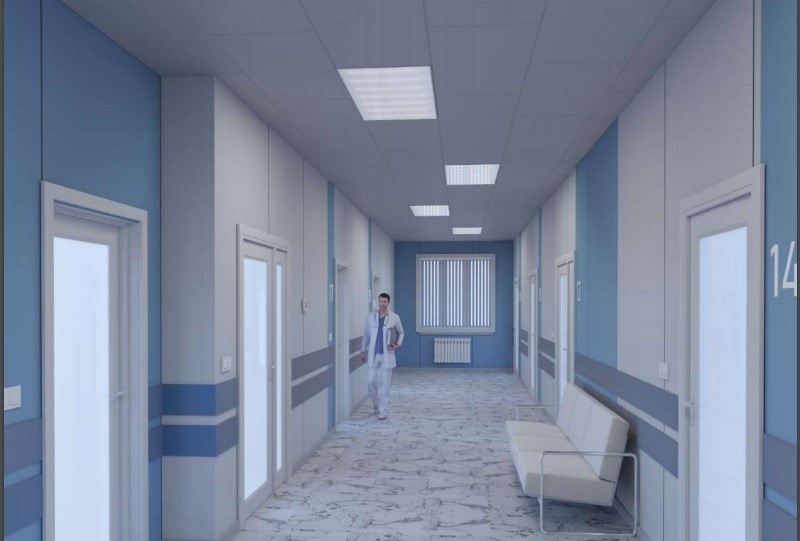 Одноэтажная больница площадью около 600 квадратных метров будет включать в себя дневной стационар, процедурный кабинет, кабинеты врачей, лабораторию — всего 11 помещений. В подвале оборудуют бытовые комнаты и тепловой узел.