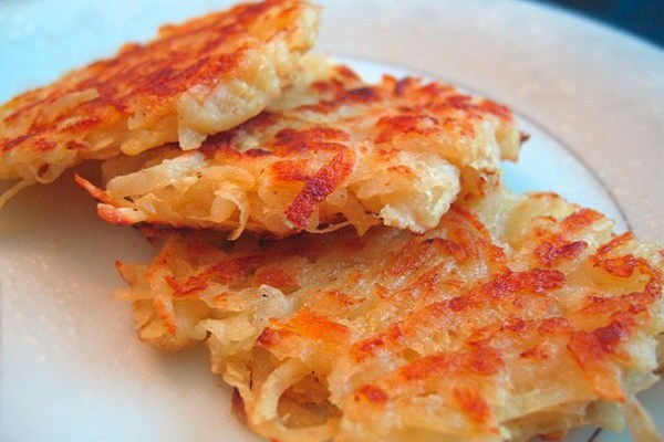Натереть картофель на крупную терку, добавить перец и соль. Налить растительное масло в сковороду и через 30 секунд положить туда порубленный чеснок. Когда от чеснока будет идти запах, положить на сковородку (очень хорошо получается на сковородке гриль) и немного примять вилкой.