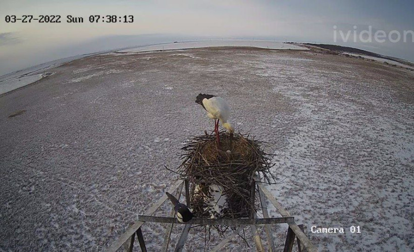 Видеокамера, установленная у одного гнезда дальневосточных аистов в Тамбовке, зафиксировала, как птицы начали высаживать первое яйцо. Об этом сообщил в своем телеграм-канале кандидат биологических наук, координатор программы АмурСоЭС по сохранению этих птиц Антон Сасин.