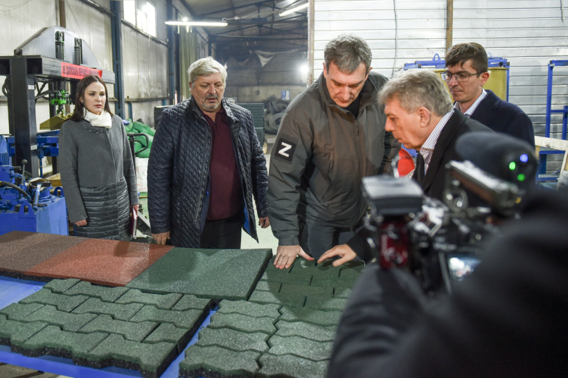 Губернатор и глава Белогорска вместе побывали на предприятии. Станислав Мелюков рассказал, что покрытие, изготавливаемое из резиновой крошки, планируется использовать в детских садах города.