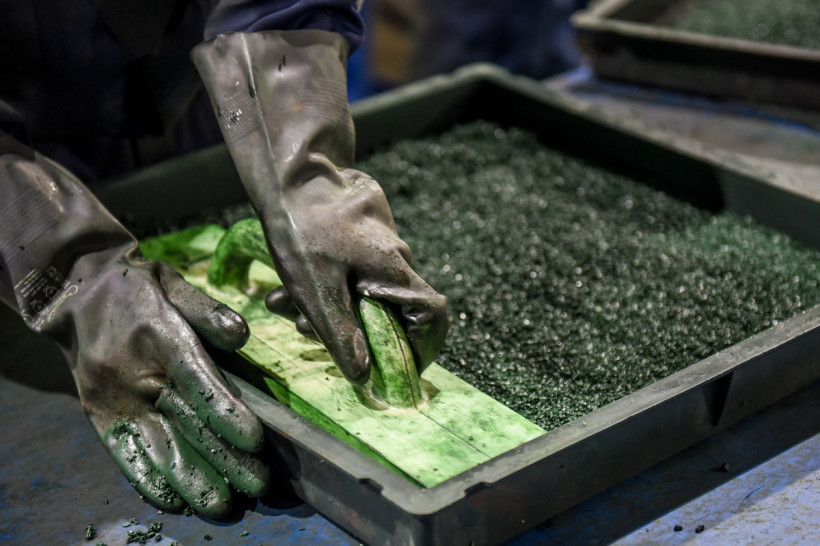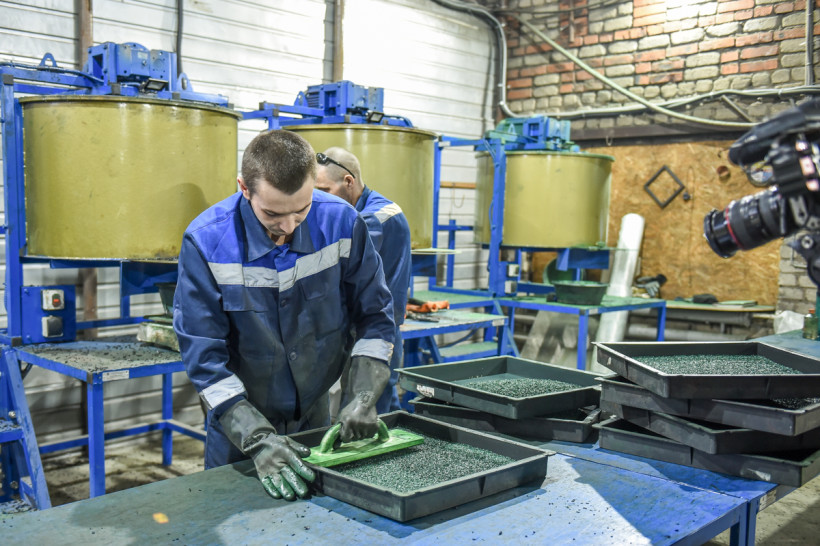 В большом светлом цехе с самого утра кипит работа. Резиновую крошку, перемешанную с клеем и красящим пигментом, достают из огромного миксера и выкладывают в форму. Мастера тщательно разравнивают поверхность специальным инструментом. Затем сырье уходит под пресс и в сушильную камеру, где несколько часов застывает при высокой температуре.