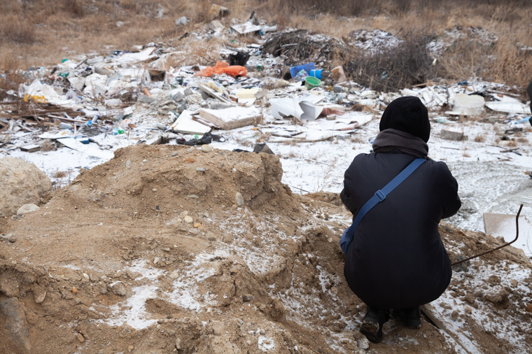 Первый объект обнаружили в нескольких метрах от дороги, ведущей к танковому полигону ДВОКУ. В одной куче перемешались стекло, строительный мусор после ремонта, отходы, которые люди обычно выбрасывают в контейнеры, и даже застывший бетон вперемешку с ветошью. Свалку на картах хорошо видно сверху: белое пятно на зеленом поле. На такие пятна как раз и обращают внимание защитники природы, когда скроллят карты вокруг дорог и населенных пунктов. В реальности мусором оказалось завалено небольшое озеро. Вокруг следы машин — значит, люди давно сюда ездят со своими отходами.