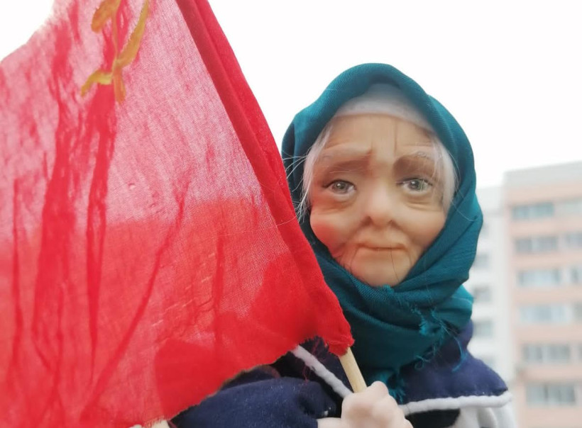 Старушка у Натальи получилась небольшой. Высота фигурки от валеночек до макушки всего 27 сантиметров. Зато куколка увесистая — из-за тяжеленького проволочного каркаса. Наталья старалась соблюсти все пропорции, даже когда мастерила красное знамя. Хотя сшито оно не из шелка, а из тончайшей хлопчатобумажной ткани, развевается на ветру как шелковое. Желтой акриловой красной Наталья нарисовала на нем серп, молот и звезду.