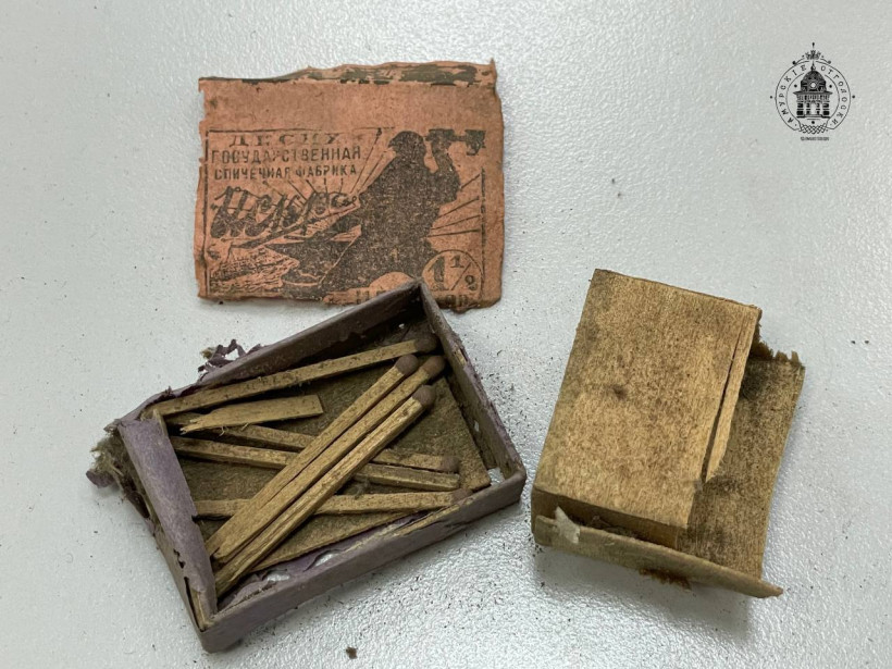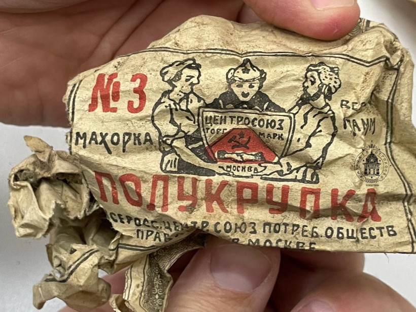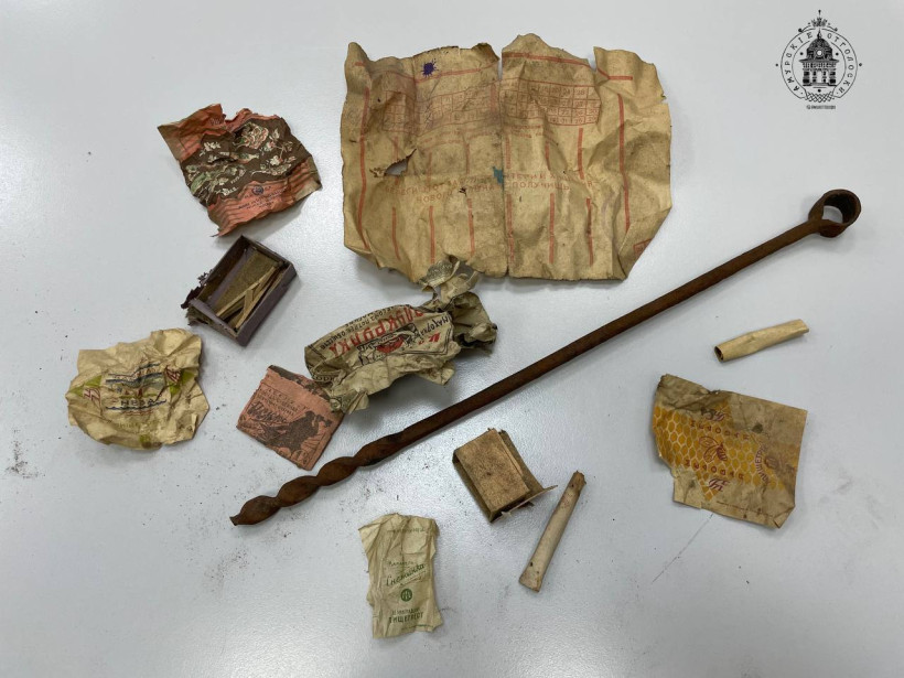 Помимо хлебной карточки были найдены интереснейшие обертки от конфет и карамели, махорки, фрагменты папирос, спички благовещенской фабрики «Искра» и ручная дрель. «Посмотрел в интернете, что упаковка из-под махорки точно 20-х годов прошлого века, поэтому уверен, что и другие находки примерно этого периода», — добавил Дмитрий Евсеев.
