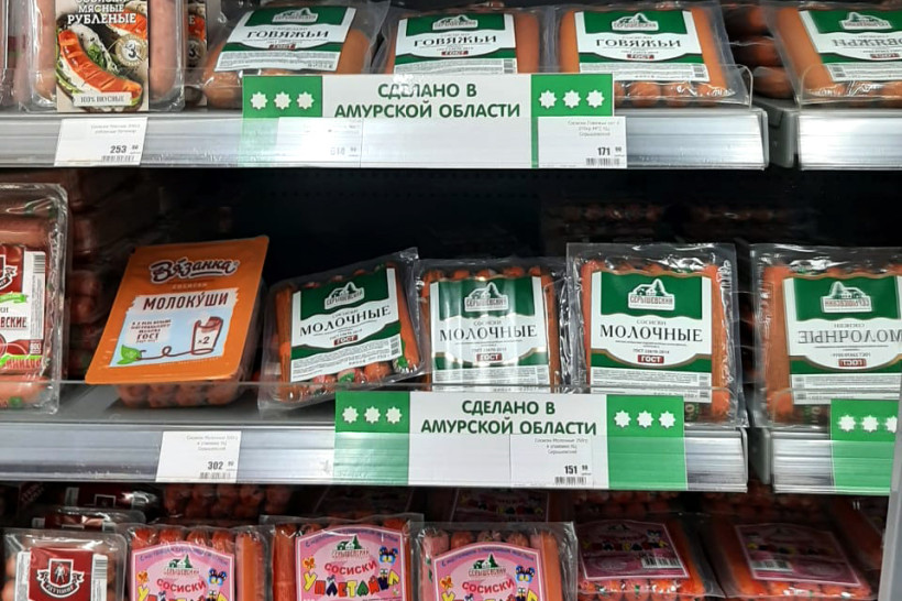 На прилавках нескольких торговых сетей Благовещенска появились зелено-белые ценники. Власти, представители ритейлеров и производители определили 42 товара, цены на которые не будут повышаться до конца второго квартала этого года. Молочную, мясную продукцию, яйца и овощи из этого списка отмечают ценниками с надписью «Сделано в Амурской области».