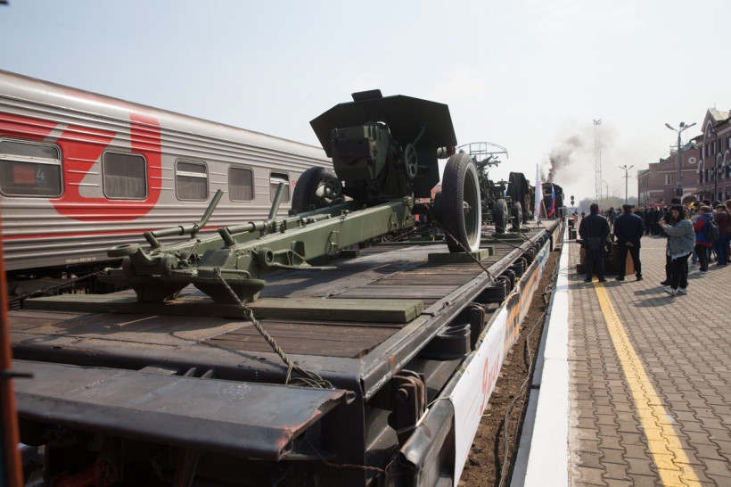 Разработанный в конце Второй мировой под руководством конструктора Льва Лебедянского паровоз знаменитой серии «Л» вышел из Благовещенска вместе с двумя платформами с военной техникой, платформой-сценой, вагоном-теплушкой и тремя пассажирскими вагонами.