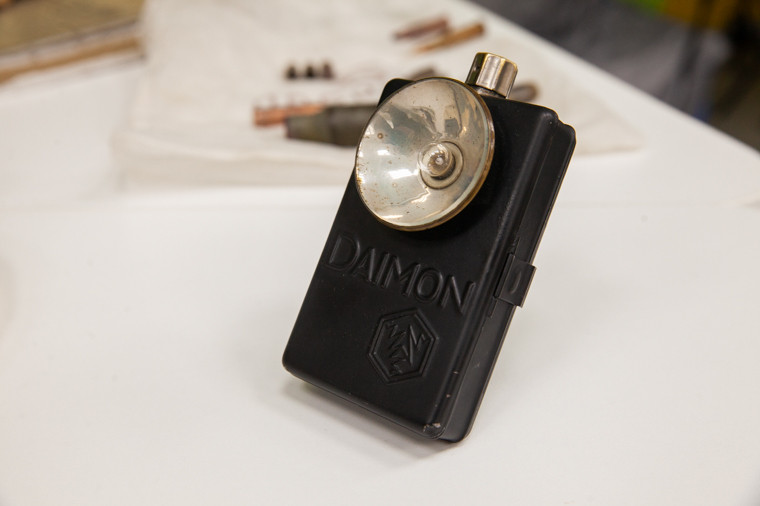 — Фонарик мне от дедушки достался, который воевал с 1943 года — начал с Курской дуги и до Германии дошел, — продолжил Павел. — Он его правда не с войны привез. В Благовещенске после войны немецких трофейных вещей много было, здесь его и купил, наверное. Я фонарик только заново покрасил и батарейку вставил. Работает! У него скобка сзади удобная, его немцы на пуговицу или погон вешали. И светит, и руки свободные. Механизм включения — пуговка из латуни. Я поэтому сделал вывод, что фонарик еще довоенный. Во время войны в Германии наступил жесткий дефицит цветных металлов, и латунь использовали только на военные нужды.