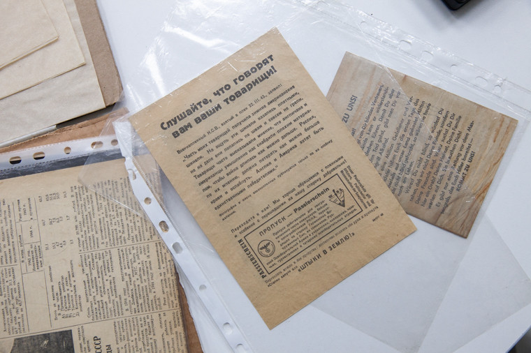 Отдельная часть экспонатов посвящена популярной и сейчас информационной войне. Это агитационные листовки — как советские, так и немецкие. Обе призывают сдаваться в плен противников.