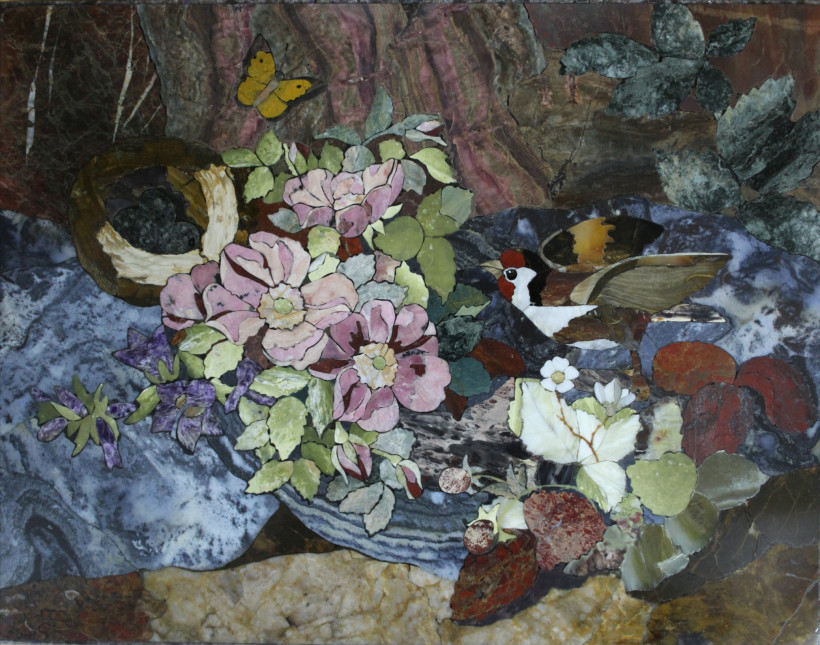 Суть древней мозаичной техники в том, что из распиленных на пластины камней выкладываются картины. Каменные детали подгоняются друг к другу так плотно, чтобы стыка практически не было видно. Затем детали мозаики склеиваются на подложку и шлифуются до зеркального блеска. Такая картина практически вечная: не поблекнет, не разобьется. Каждая из мозаик уникальна и неповторима.
