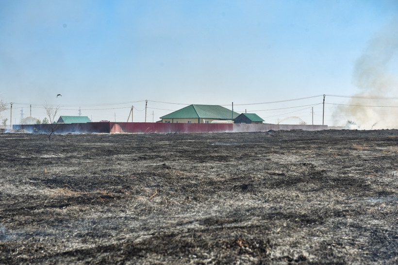 В районе села Волково сбоку от трассы на фоне яркого голубого неба виден большой столб дыма — пал начался от дороги и черным пятном пополз по высокой сухой траве вглубь, к жилым коттеджам. Совсем недалеко от линии огня – ремонтный гараж и автозаправка. Набравшее силу пламя пытаются отбить двое сотрудников пожарного поста села Грибского, но огонь уже распространился на сотни метров и вплотную подходит к железному забору жилого дома.