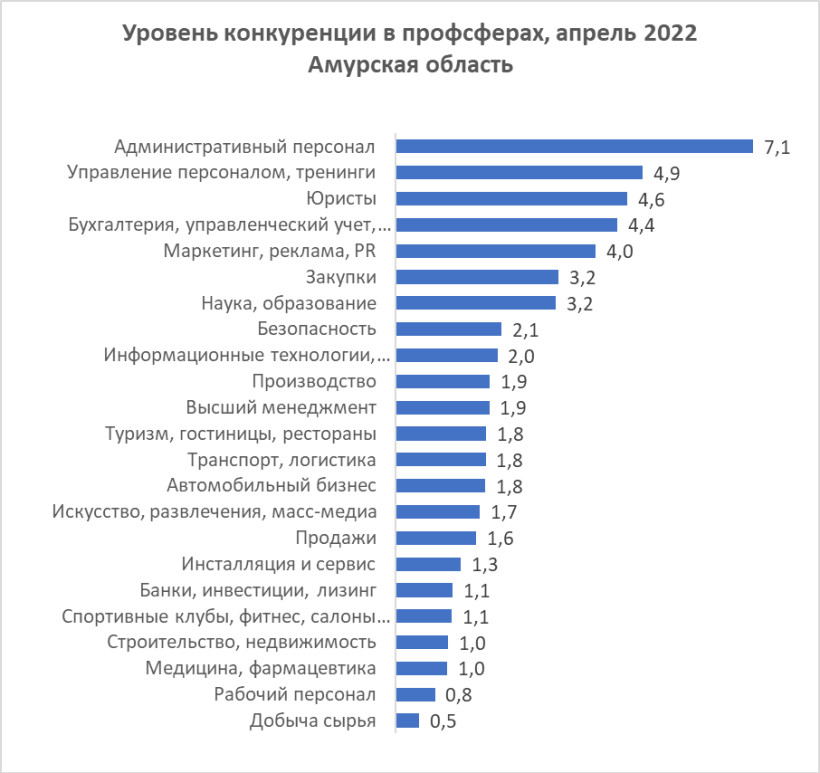 Конкуренция за рабочие места в Амурской области выросла в апреле 2022 года. Теперь работодателям поступает до четырёх резюме на вакансию против 3,3 в феврале. Больше всего кандидатов на должность в сфере администрирования и управления персоналом, юриспруденции и бухгалтерии. Соответственно, занять вакантное место в этих сферах стало сложнее.