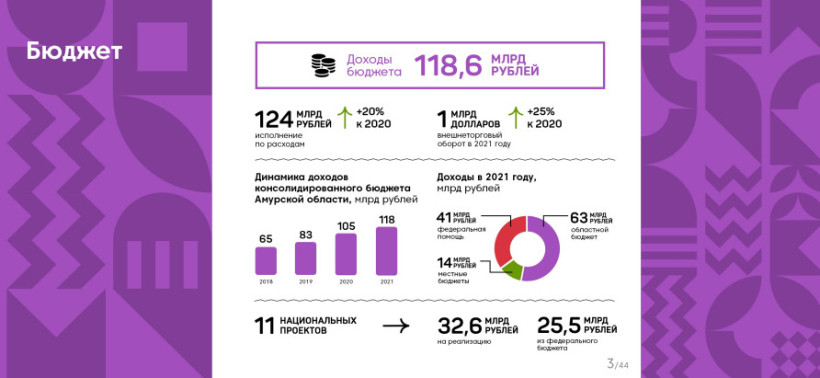 Несмотря на пандемию, внешнеторговый оборот Приамурья в прошлом году увеличился на четверть и превысил один миллиард долларов. Исполнение по расходам составило почти 124  миллиарда рублей, на 20 процентов больше уровня 2020 года. Прежде всего это расходы на социальную сферу, экономику, образование, здравоохранение и  ЖКХ. На борьбу с коронавирусной инфекцией было выделено 1,2 миллиарда рублей, на ликвидацию последствий паводков — еще 3 миллиарда.