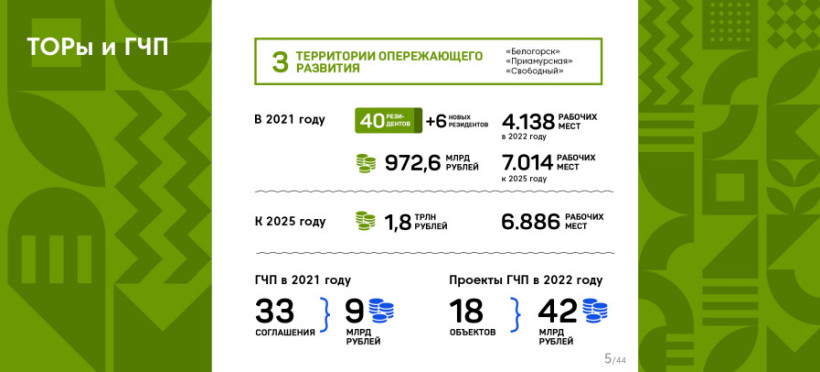 В Приамурье успешно работают три территории опережающего развития. Всего зарегистрировано 40 резидентов, в том числе 6 компаний в 2021 году. Общий объем вложений всеми резидентами составляет более 970 миллиардов рублей.