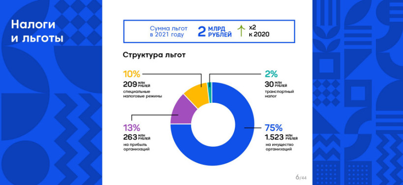 Были сохранены преференции по налогу на имущество и прибыль организаций, транспортному налогу, по специальным налоговым режимам. Сумма льгот, по предварительной оценке, составила более 2 миллиардов рублей. Это в 2 раза больше уровня 2020 года.