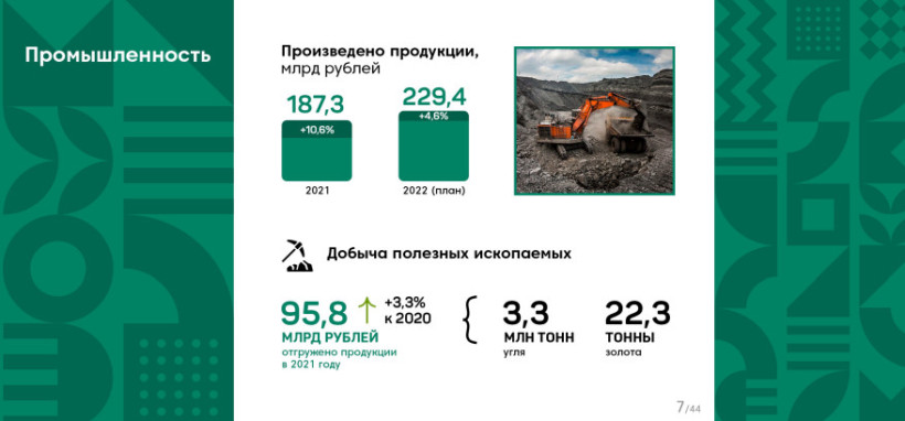 Первое место занимает добыча полезных ископаемых. В прошлом году было отгружено продукции на 95 миллиардов рублей. За год добыто 22 тонны золота. Это меньше, чем в 2020-м. Причины объективные — летние паводки. В то же время значимым событием для отрасли стал запуск цеха флотации на обогатительной фабрике рудника Пионер.