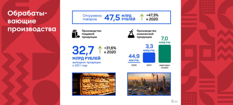 В 2021 году на второе месте в структуре нашей промышленности вышли обрабатывающие производства, сместив энергетику на третье место. Отгружено товаров на 47,5 миллиарда рублей, в полтора раза больше, чем в 2020-м. В этом году ожидаем прирост еще на 7 процентов.