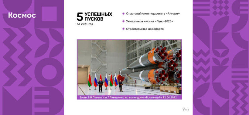 В прошлом году продолжалось развитие перспективной для нас космической отрасли. Были произведены рекордные для космодрома 5 успешных пусков за год. Началось возведение аэропортового комплекса. Смонтирован стартовый стол под ракету-носитель «Ангара», строители приступили к сборке кабель-заправочной башни. Это самое массивное сооружение стартового комплекса  высотой в  66 м и весом 3 тысячи  тонн.