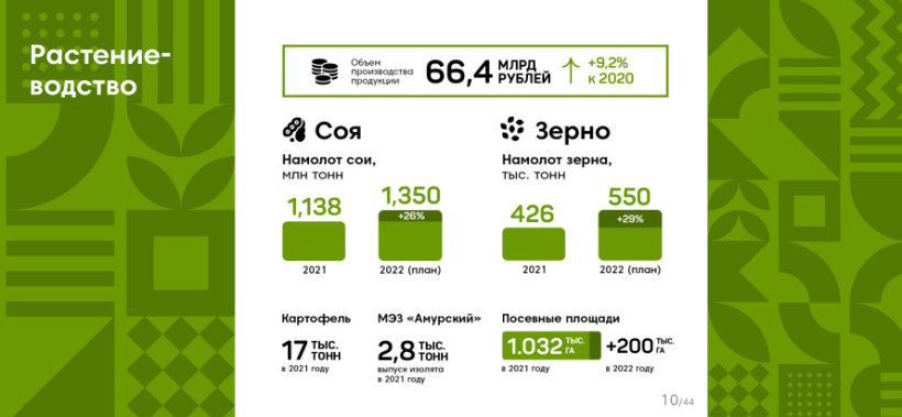 В растениеводстве, несмотря на сложный полевой сезон, наши аграрии смогли добиться хороших результатов. Собрано  более 426 тысяч тонн зерновых и зерно-бобовых культур и порядка 17 тысяч тонн картофеля. Общий намолот сои составил 1 миллион 138 тысяч тонн. Это на 18 процентов больше уровня 2020 года. При этом выросла и урожайность. По зерну прирост составил 14 процентов, а по сое поставили рекорд — 15,7 центнера с гектара, прирост составил более 20 процентов. Общая посевная площадь составила 1 миллион 32 тысяч гектаров, в этом году она вырастет почти на 200 тысяч. План по зерну  — 550 тысяч тонн, по сое — 1 миллион 350 тысяч тонн.