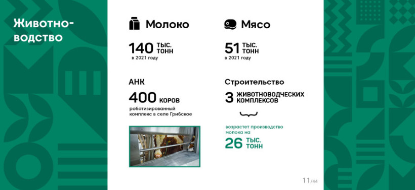 В декабре прошлого года агрофирма АНК завершила модернизацию роботизированного животноводческого комплекса в селе Грибском. Это позволило дополнительно разместить 400  коров и увеличить производство молока. В графике идет строительство еще трех крупных животноводческих комплексов. По завершении ежегодное производство молока возрастет на 26 тысяч тонн.